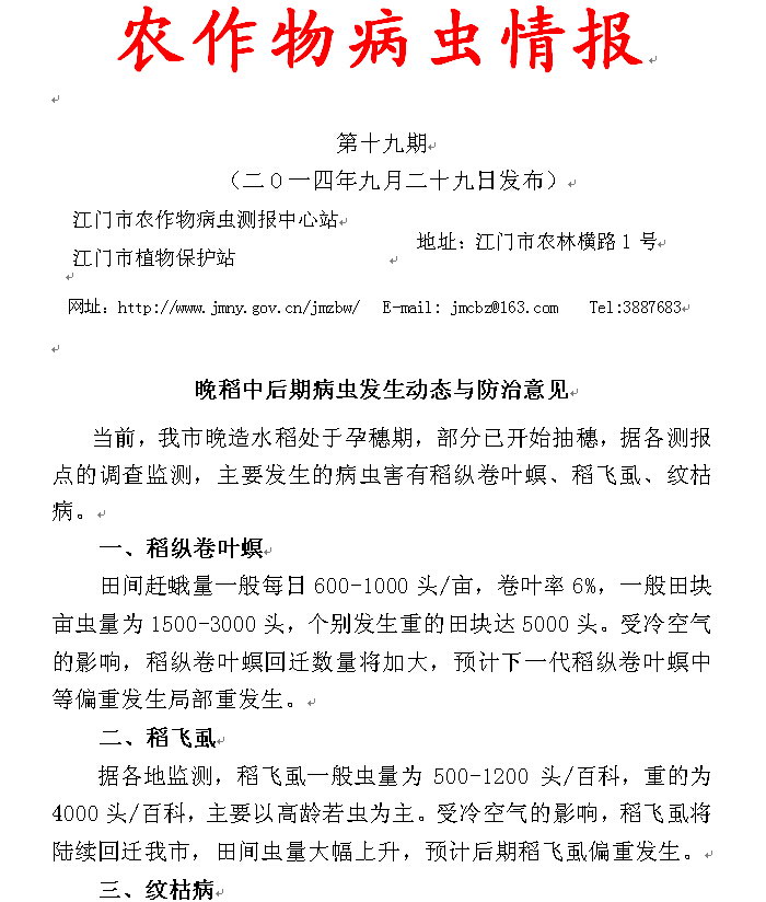 2014年农作物病虫情报第十九期(晚稻中后期病虫发生动态与防治意见)