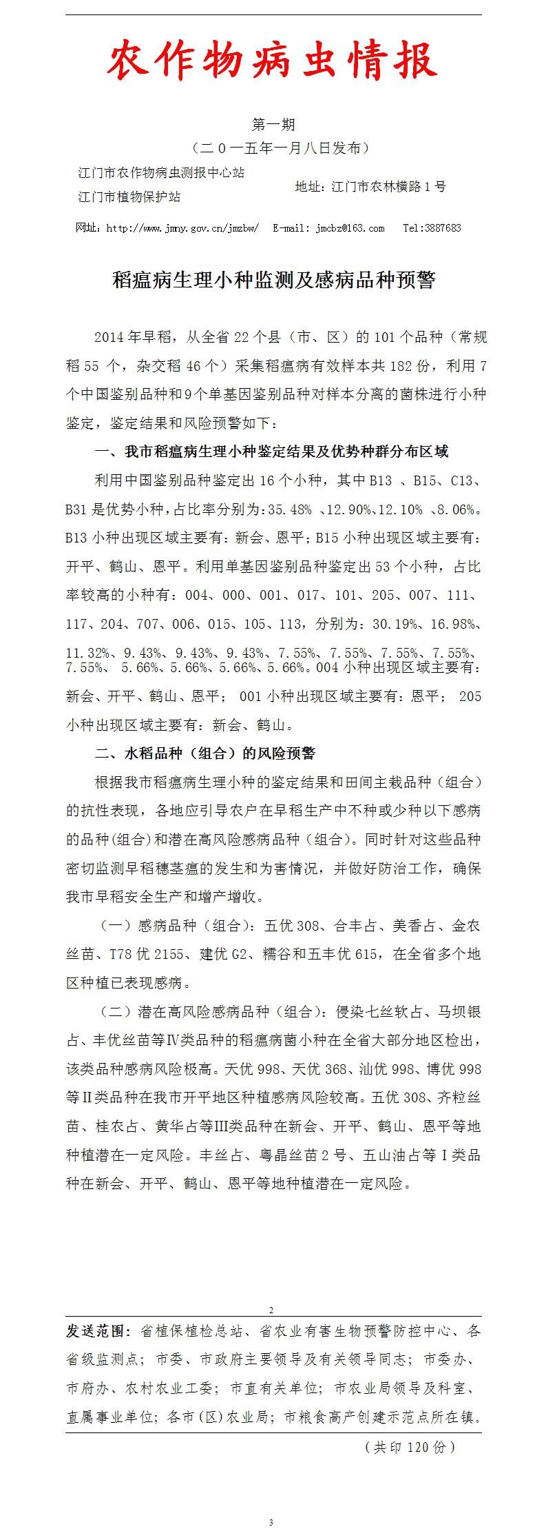 2015年农作物病虫情报第一期(稻瘟病生理小种监测及感病品种预警)