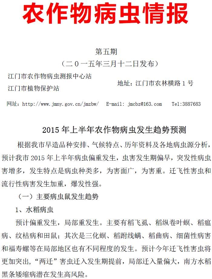 2015年农作物病虫情报第五期