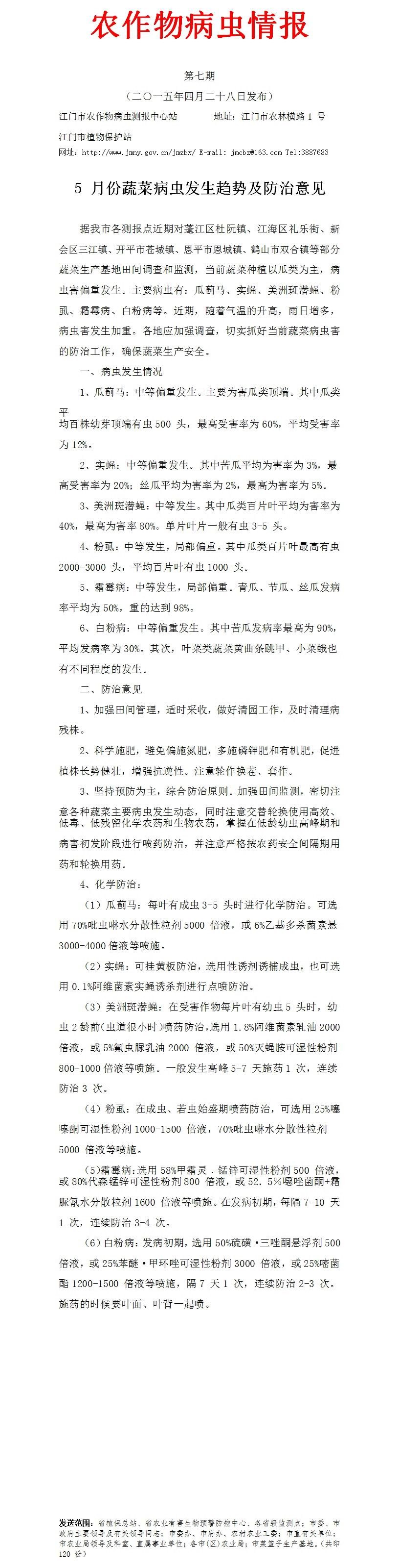 2015年农作物病虫情报第七期(5月份蔬菜病虫发生趋势及防治意见)