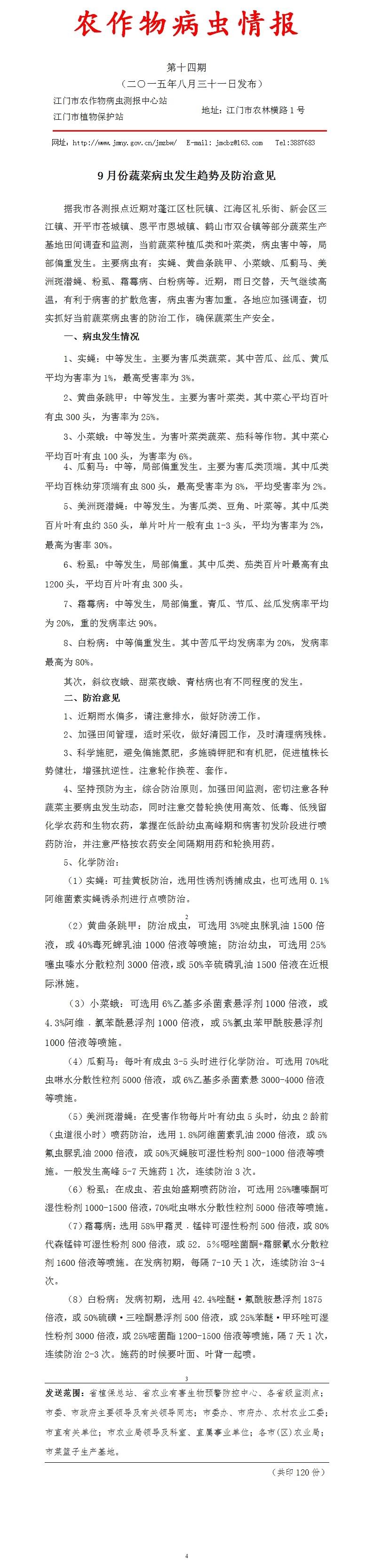 2015年农作物病虫情报第十四期(9月份蔬菜病虫发生趋势及防治意见)