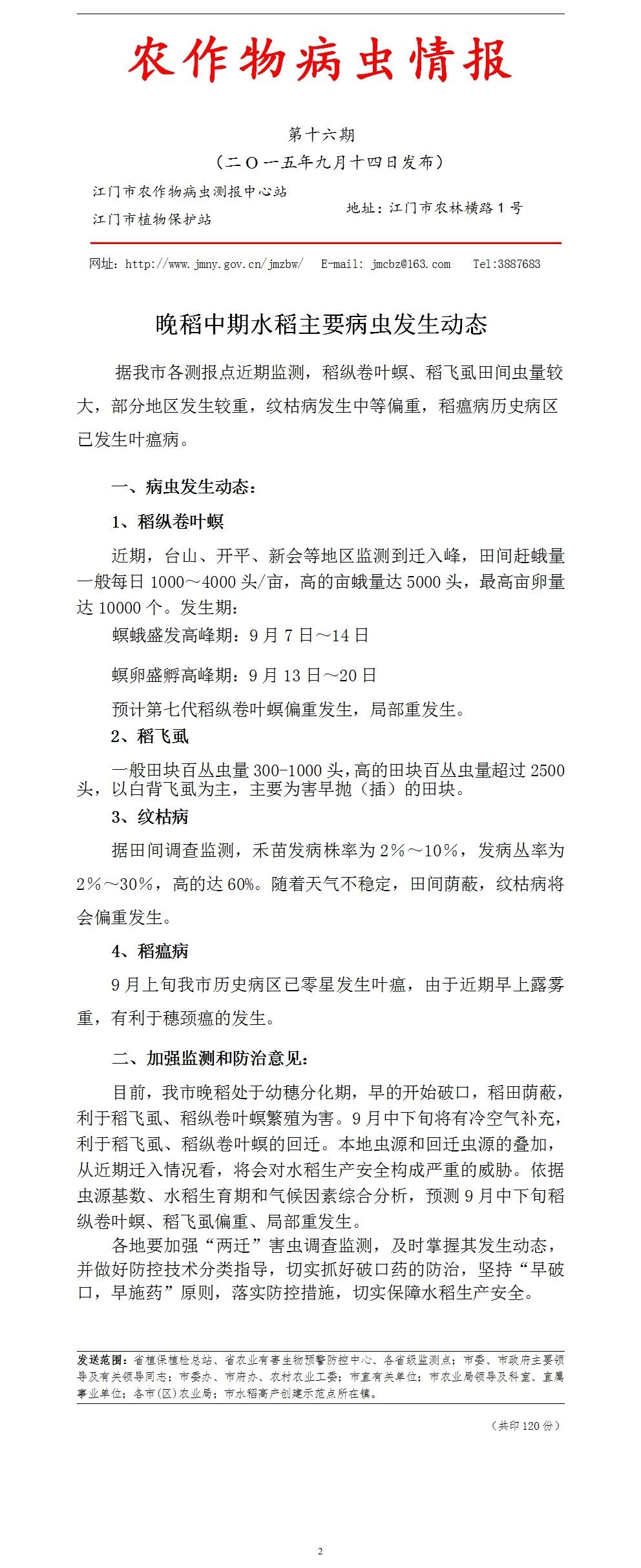 2015年农作物病虫情报第十六期(晚稻中期水稻主要病虫发生动态)