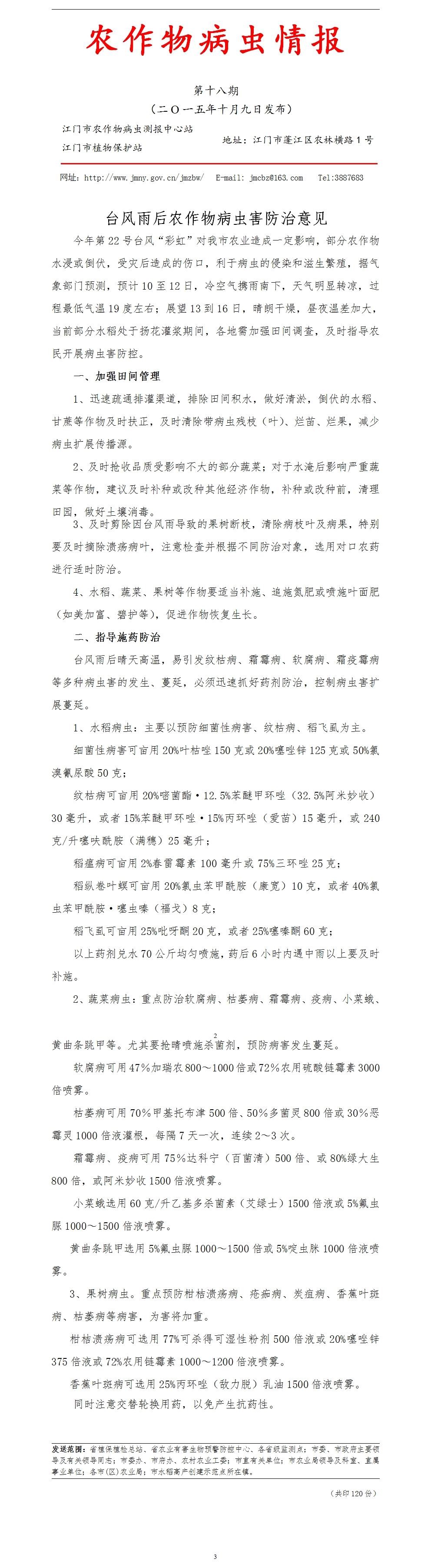 2015年农作物病虫情报第十八期(台风雨后农作物病虫害防治意见)