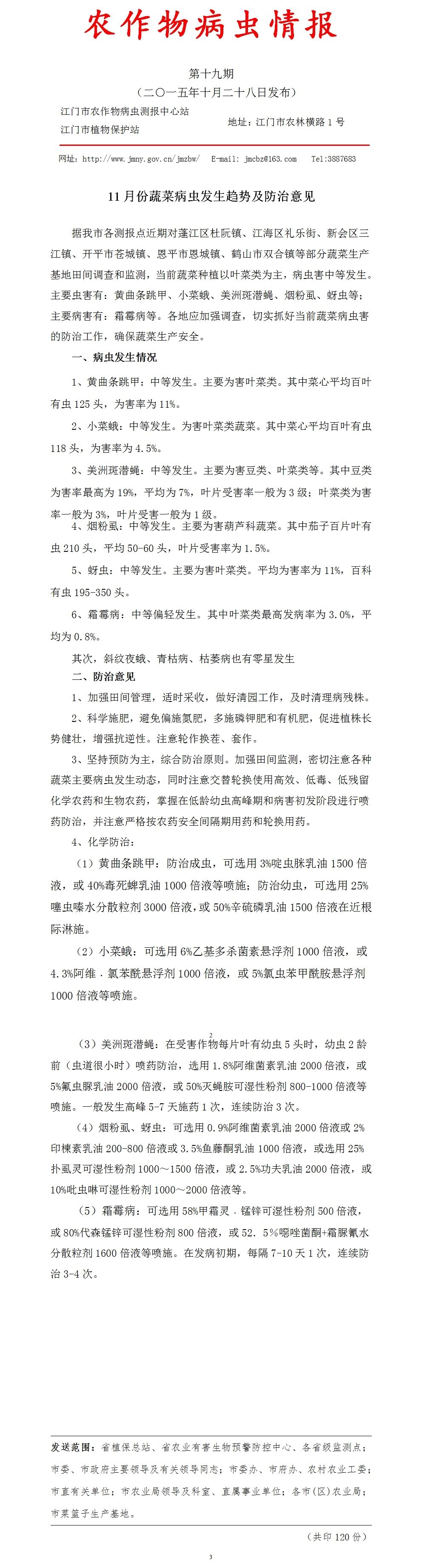 2015年农作物病虫情报第十九期(11月份蔬菜病虫发生趋势及防治意见)