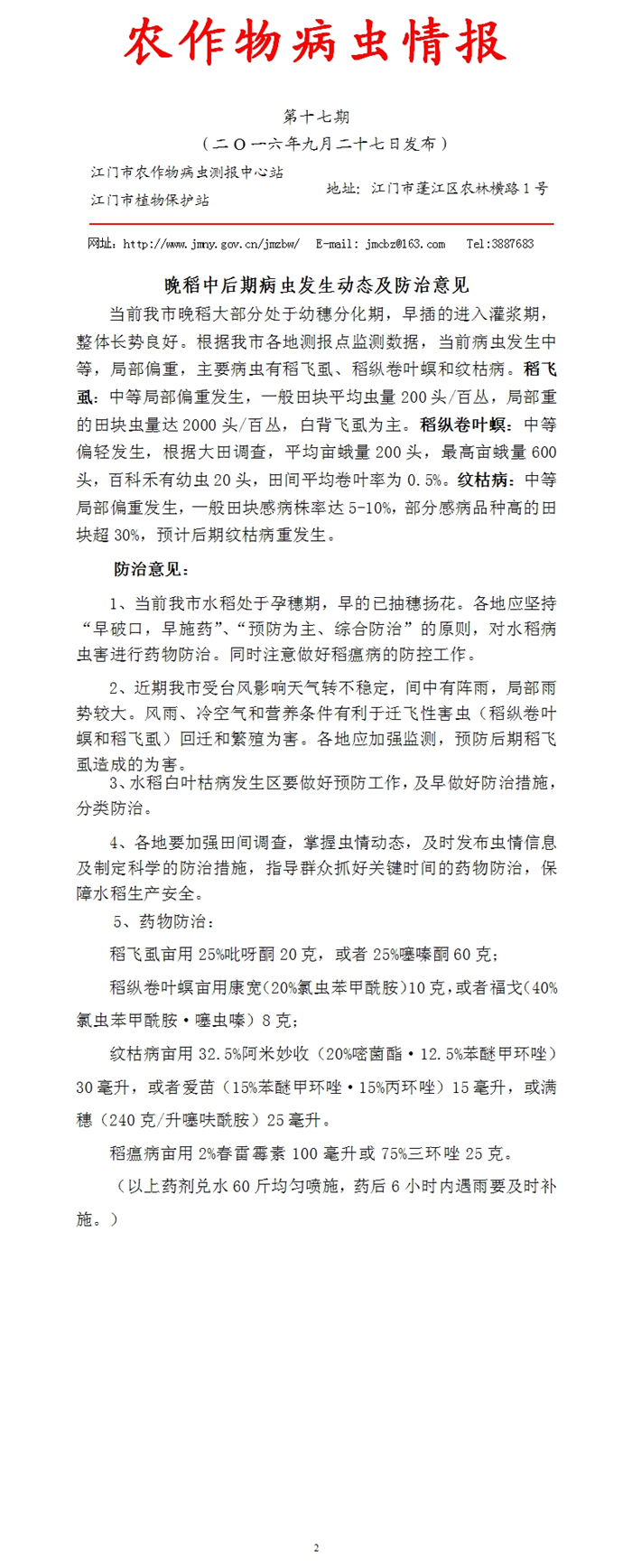 2016年农作物病虫情报 第十七期
