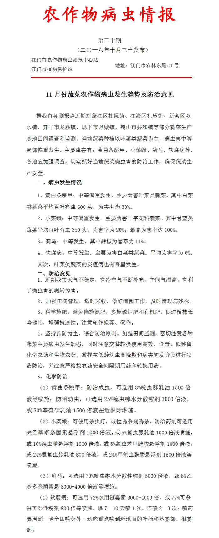 (11月份蔬菜农作物病虫发生趋势及防治意见)