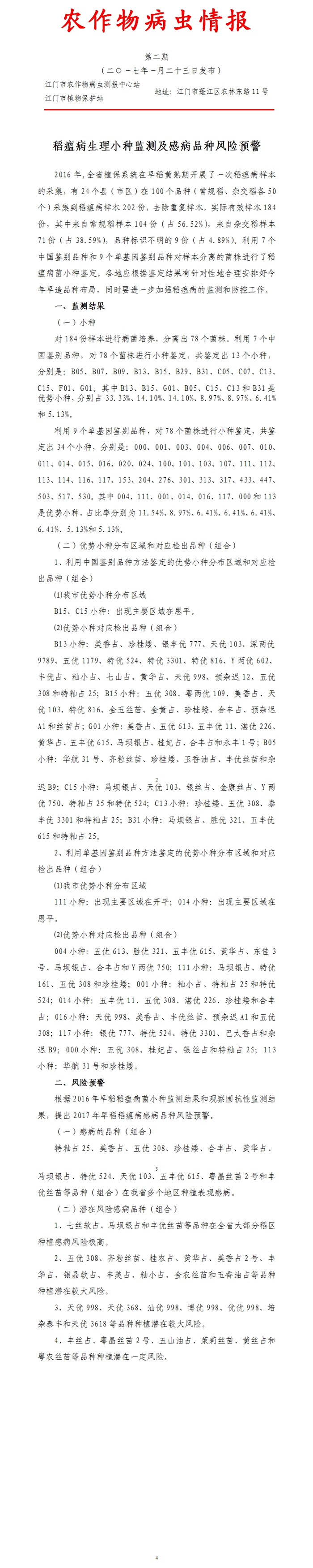2017年农作物病虫情报 第二期(稻瘟病生理小种监测及感病品种风险预警)