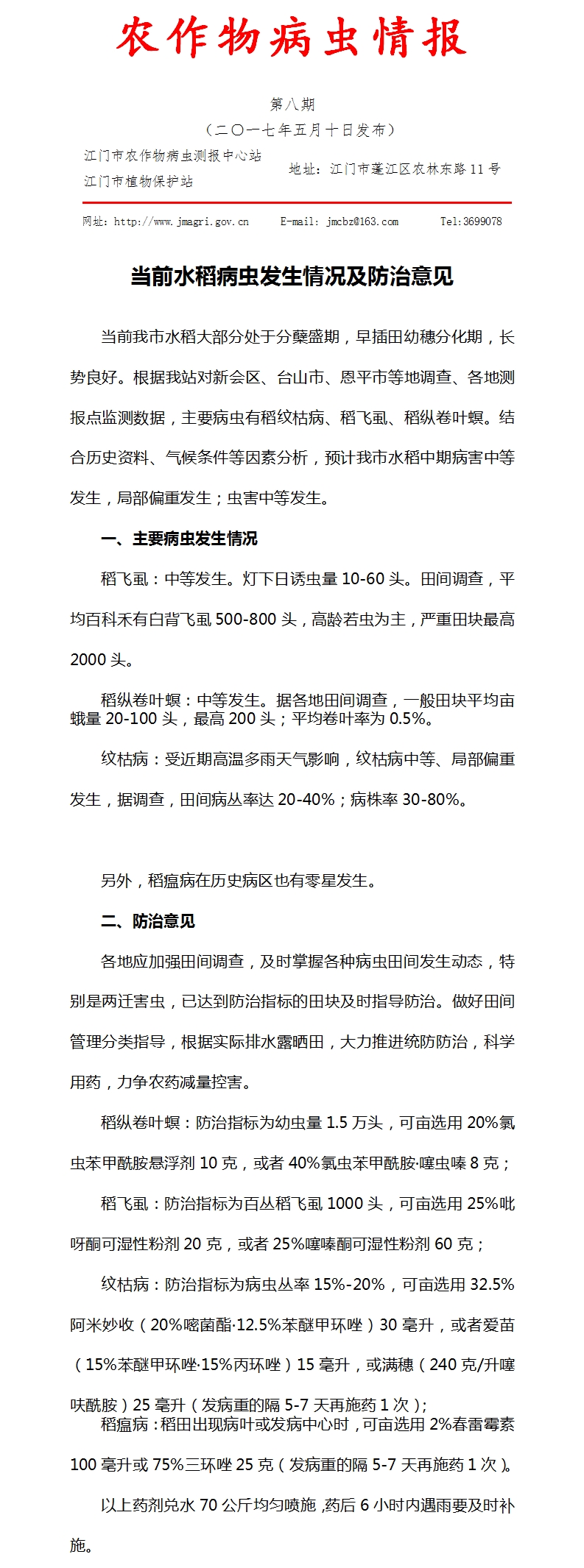 2017年开云电竞官方网站农作物病虫情报 第八期(当前水稻病虫发生情况及防治意见)