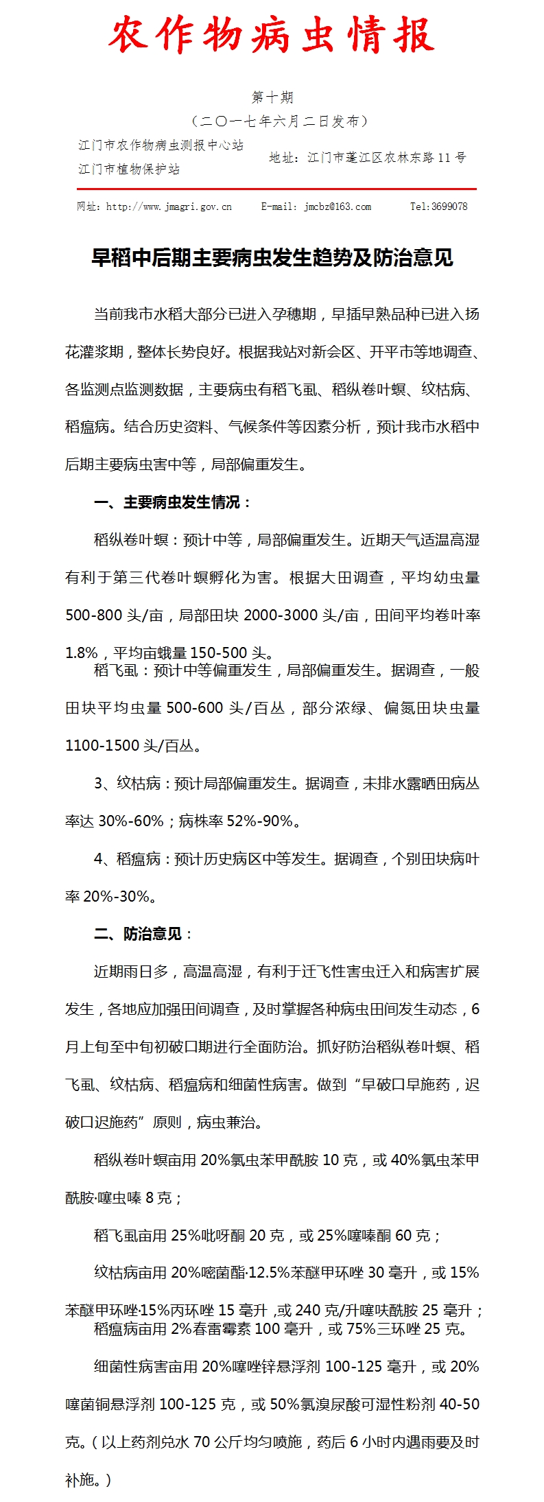 2017年开云电竞官方网站农作物病虫情报 第十期(早稻中后期主要病虫发生趋势及防治意见)