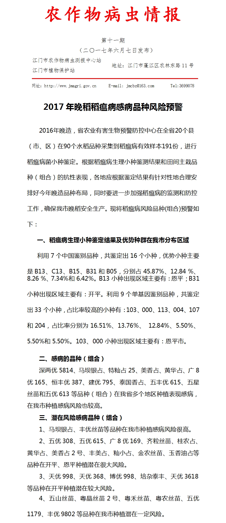 2017年开云电竞官方网站农作物病虫情报 第十一期(晚稻稻瘟病感病品种风险预警)