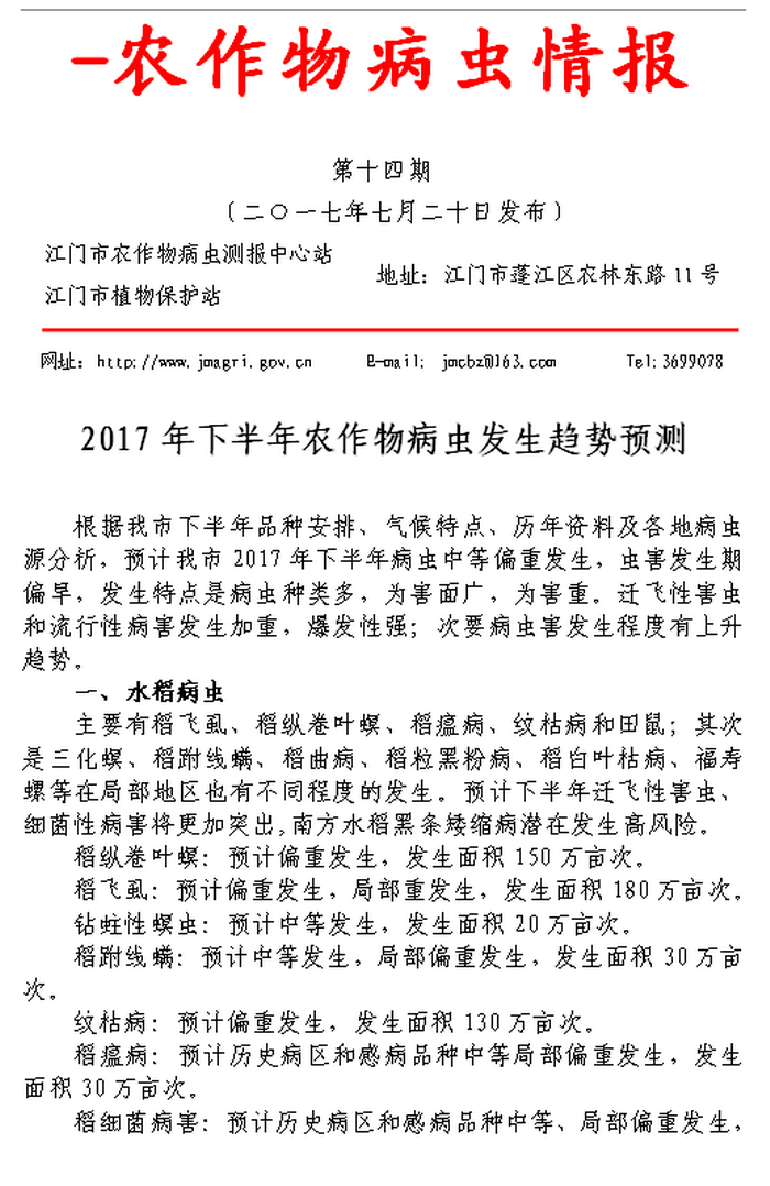 2017年开云电竞官方网站农作物病虫情报 第十四期(2017年下半年农作物病虫发生趋势预测)