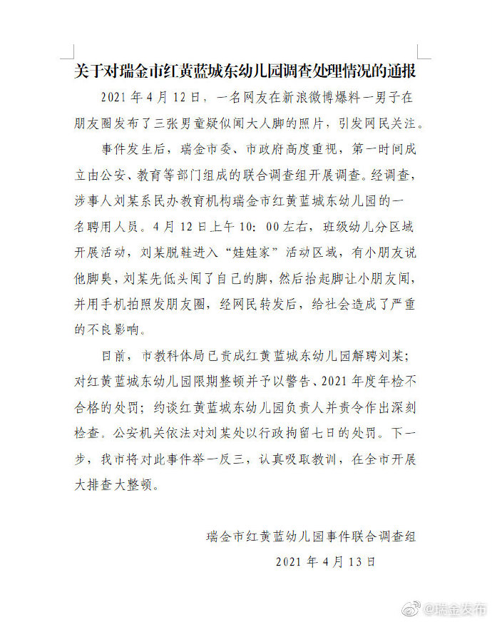 中新网4月13日电 据江西瑞金市委宣传部官方微博消息,瑞金市红黄蓝幼儿园事件联合调查组13日发布通报称,2021年4月12日,一名网友在新浪微博爆料一男子在朋友圈发布了三张男童疑似闻大人脚的照片,引发网民关注。目前,瑞金市教科体局已责成红黄蓝城东幼儿园解聘刘某,公安机关依法对刘某处以行政拘留七日的处罚。
