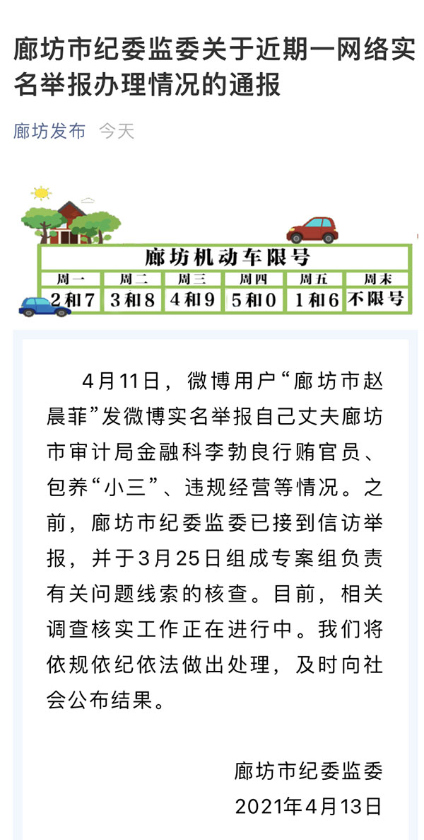 对此,4月13日,廊坊市纪委监委发布对该情况的办理通报。通报称,4月11日,微博用户“廊坊市赵晨菲”发微博实名举报自己丈夫廊坊市审计局金融科李勃良行贿官员、包养“小三”、违规经营等情况。之前,廊坊市纪委监委已接到信访举报,并于3月25日组成专案组负责有关问题线索的核查。目前,相关调查核实工作正在进行中。该委将依规依纪依法做出处理,及时向社会公布结果。