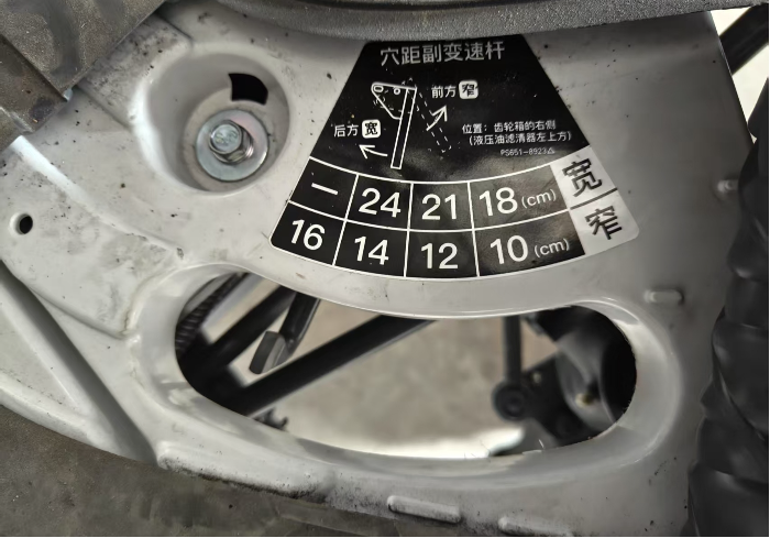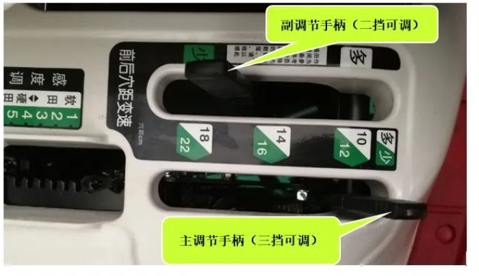 如需调整为10cm株距,穴距调节手柄(见上图)拨至“10/18”位置,然后将穴距宽窄切换手柄(见下图)拨至“前方”位置,如需调整为18cm株距,穴距调节手柄拨至“10/18”位置,然后将穴距宽窄切换手柄拨至“后方”位置。