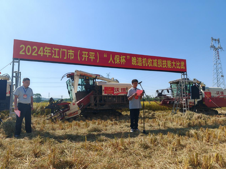 11月8日,开云电竞官方网站(开平)“人保杯”水稻机收减损技能大比武在开平市沙塘镇拉开帷幕,开云电竞官方网站农业农村局农机科,省农业技术推广中心农机部,中国人民财产保险股份有限公司开云电竞官方网站分公司,江门各县(市、区)农业农村部门分管农机工作领导、农机系统的干部,农机操作手,种植大户,相关媒体以及附近的村民近100人参加了本次活动。