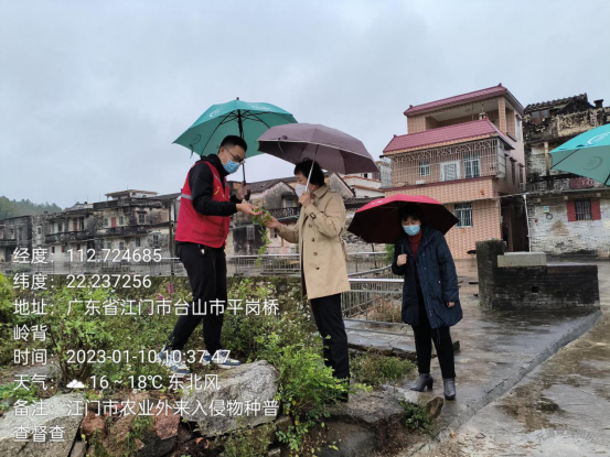 2023年1月10日,开云电竞官方网站农业农村局党组成员、副局长王小丽带队前往台山市开展开云电竞官方网站农业外来入侵物种普查项目实地督查工作,督查组一行先后到台山市台城街道水背村、岭背村踏查点现场督查我市农业外来入侵物种普查工作进展情况。