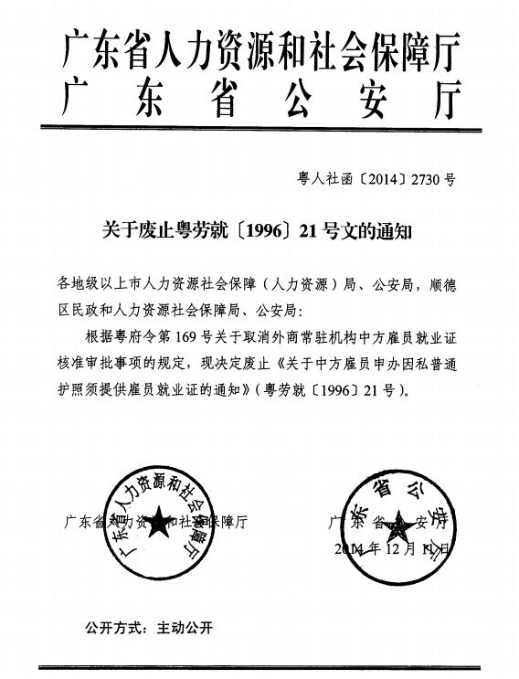 现将广东省人力资源和社会保障厅、省公安厅《关于废止粤劳就〔1996〕21号文的通知》(粤人社函〔2014〕2730号)转发给你们,请遵照执行。
