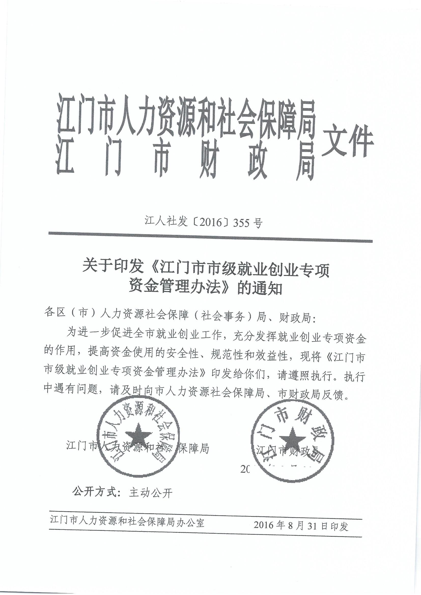 江人社发[2016]355号_此件为准 关于印发《开云电竞官方网站市级就业创业专项资金管理办法》的通知