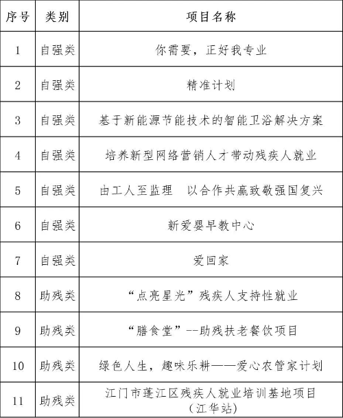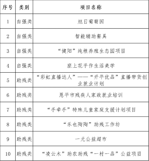 残疾人公益赛共有53个项目通过资格审核进入初赛,经过评审专家团评选,共21个项目进入复赛,其中团队组10个(自强类4个、助残类6个),企业组11个(自强类7个、助残类4个,其中后两名项目同分),具体名单公布如下(排名不分先后):