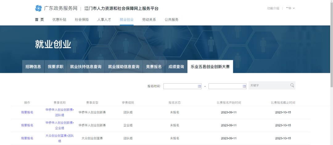 (九)成功登录后,菜单栏点击【就业创业】,选择点击【乐业五邑创业创新大赛】;