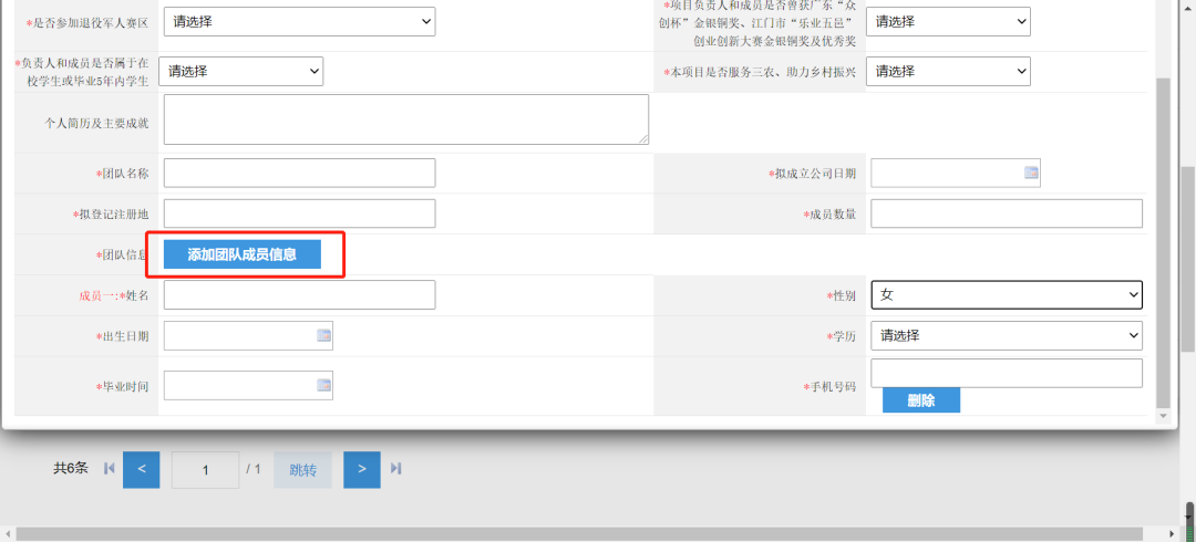 (注意:团队成员信息在基础信息左下角“团队信息”—点击【添加团队成员信息】中填写)
