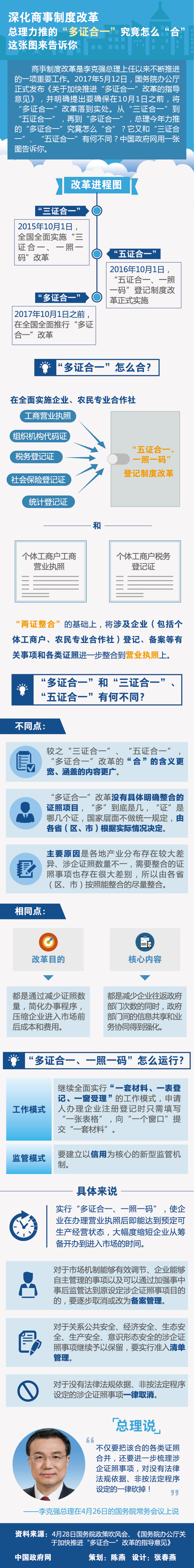 商事制度改革是李克强总理上任以来不断推进的一项重要工作。2017年5月12日,国务院办公厅正式发布《关于加快推进“多证合一”改革的指导意见》,并明确提出要确保在10月1日之前,将“多证合一”改革落到实处。从“三证合一”到“五证合一”,再到“多证合一”,总理今年力推的“多证合一”究竟怎么“合”?它又和“三证合一”、“五证合一”有何不同?中国政府网用一张图告诉你。