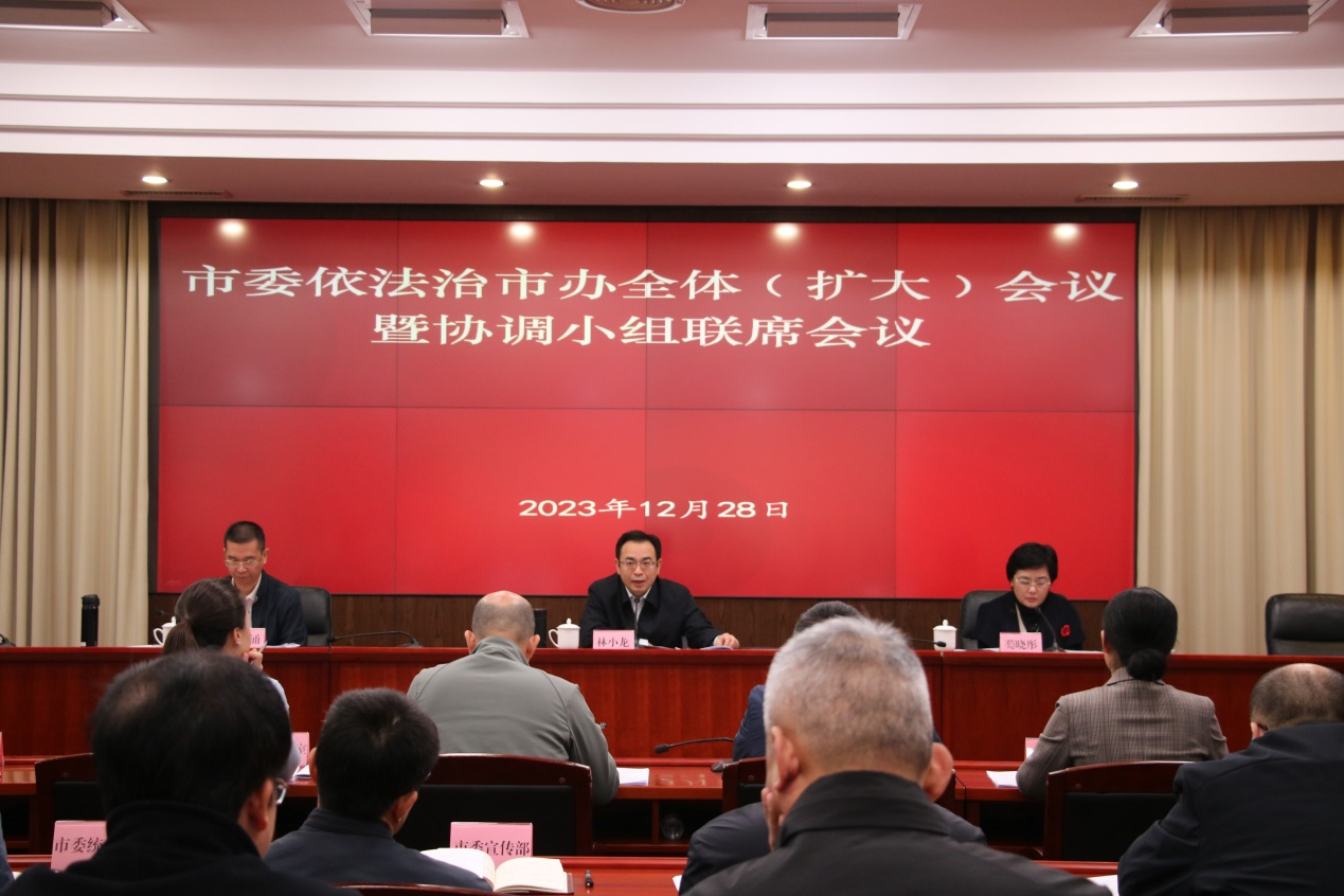 12月28日,开云电竞官方网站召开市委依法治市办全体(扩大)会议暨市委全面依法治市委员会协调小组联席会议,深入学习贯彻党的二十大精神和习近平法治思想,传达学习习近平总书记在中共中央政治局第十次集体学习时的重要讲话精神和在第十个国家宪法日之际作出的重要指示精神,以及省委和市委相关会议精神,研究部署2024年依法治市重点工作。市委常委、政法委书记、市委依法治市办主任林小龙出席会议并讲话。