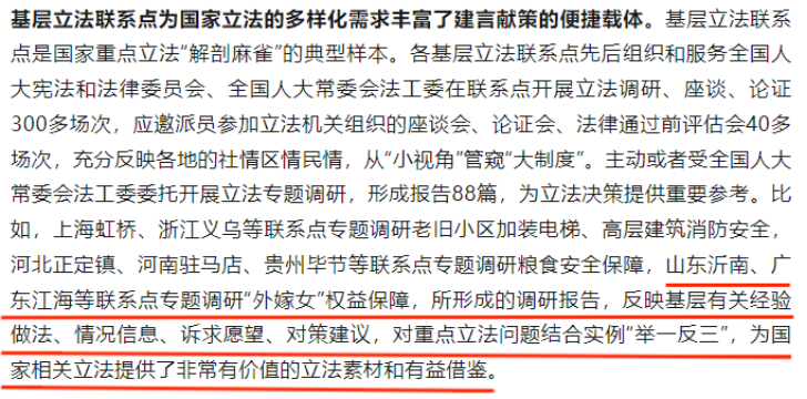 《求是》杂志2025年第5期刊载全国人大常委会法工委文章《充分发挥基层立法联系点“直通车”作用》指出,“广东江海等联系点专题调研‘外嫁女’权益保障,所形成的调研报告,反映基层有关经验做法、情况信息、诉求愿望、对策建议,对重点立法问题结合实例‘举一反三’,为国家相关立法提供了非常有价值的立法素材和有益借鉴”。