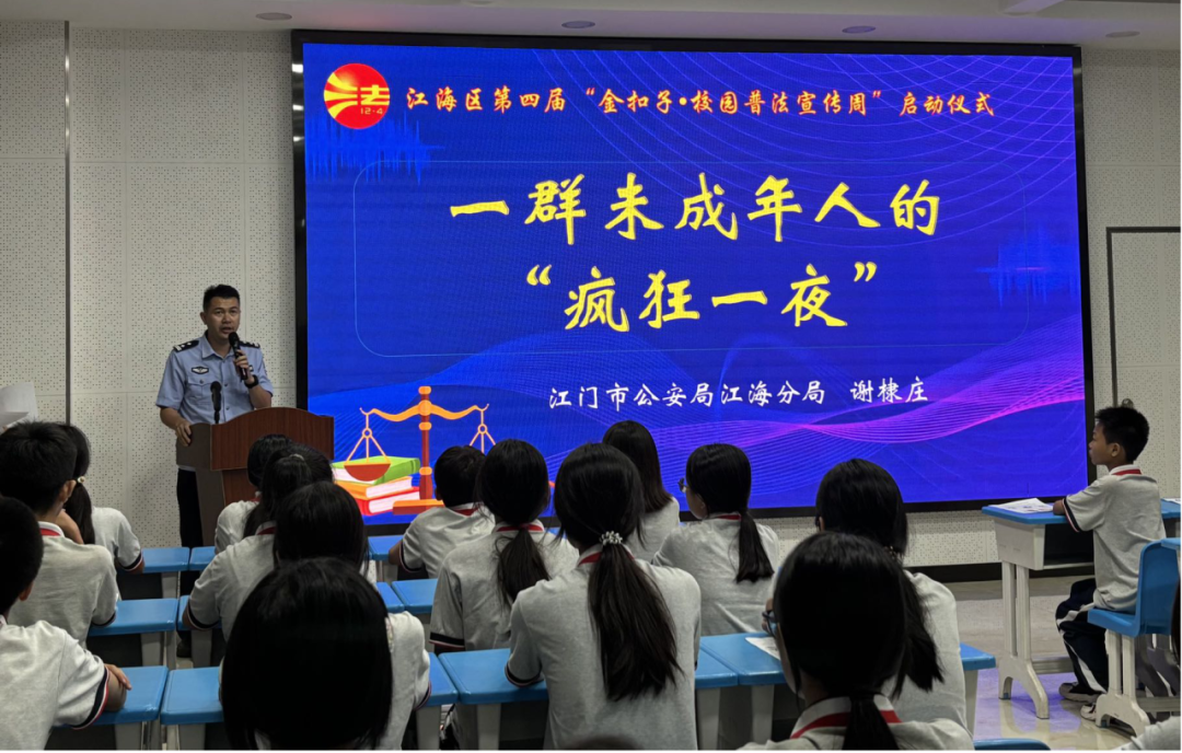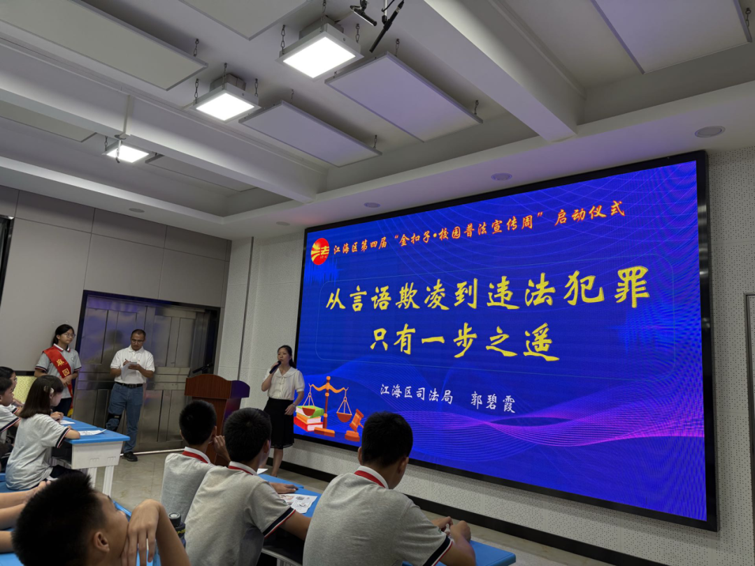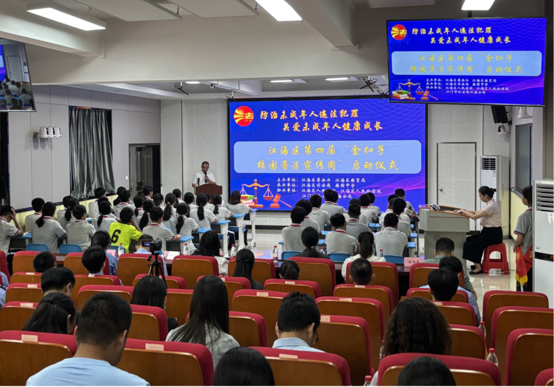 6月16日,江海区普法办、江海区教育局、江海区关工委联合在麻园中学举行第四届“金扣子·校园普法宣传周”启动仪式。来自江海区司法局、江海区教育局、江海区关工委有关领导同志、法治副校长代表、全江海区中小学学校代表以及麻园中学七八年级全体师生共650多人以线上线下的方式共同见证了这一时刻。在现场开展了哪些活动呢?快来看看吧——