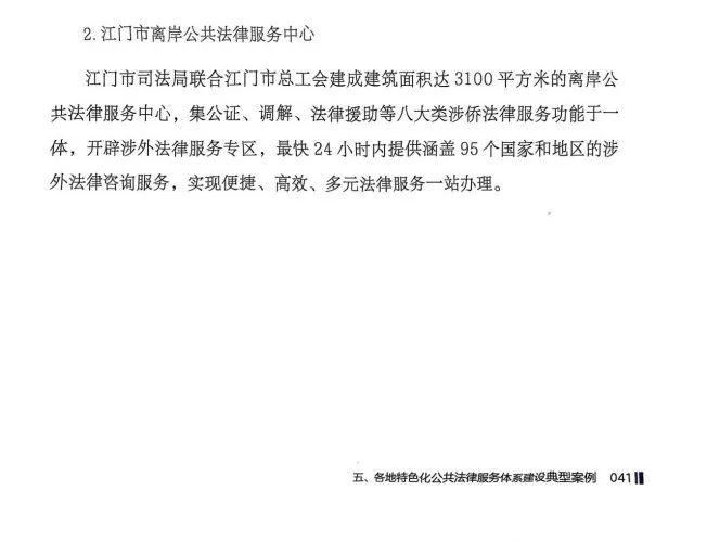 日前,中国法治出版社出版了《中国公共法律服务体系建设年度报告(2024年)》,开云电竞官方网站华侨华人离岸公共法律服务中心成功入选各地特色化公共法律服务体系建设典型案例。这是继2024年3月开云电竞官方网站公共法律服务中心获评“全国公共法律服务工作先进集体”后,江门在公共法律服务领域斩获的又一殊荣。