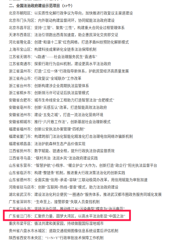 今年10月,江门法治建设再传捷报——《汇聚侨力量,圆梦大湾区,以高水平法治彰显“中国之治”》项目成功入选中央依法治国办第三批全国法治政府建设示范创建单项项目,成为全省仅有的三个入选项目之一。这份国家级荣誉,既是对江门多年来深耕涉侨公共法律服务的充分肯定,更是对侨都法治建设成效的生动诠释,也是继2024年获评“全国公共法律服务工作先进集体”后,江门在公共法律服务领域再获“国字号”殊荣。