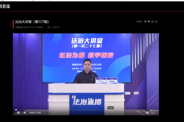 完善江门法治直播间:进一步丰富网络直播普法节目,通过主持人分析、播前微视频预告等形式吸引观众参与。截至目前,江门“法治直播间播”共播出节目161期(法治政府面对面32期,法治大讲堂129期),参与群众近1600万人次。