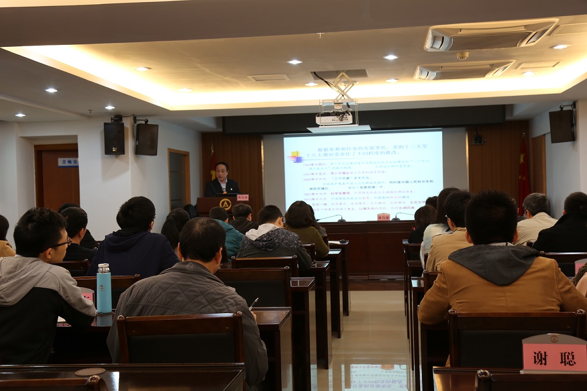 林伟雄同志以“新时代、新思想 新判断 新要求”为主题,讲述了党章的作用和地位、中国共产党成立以来对党章的修改历程,重点解读了新党章重大修改内容、亮点和特点,指明了把党的十九大报告确立的重大理论观点和重大战略思想写入党章的重大意义,提出了进一步学习党章,遵守党章,贯彻党章,维护党章的要求,号召全体党员、党组织发挥先锋模范带头作用和战斗堡垒作用,切实做到为党分忧、为国尽责、为民奉献。
