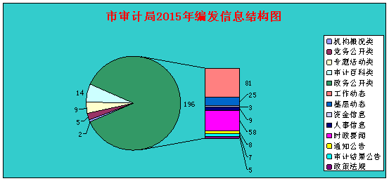 2015年在局门户网站发布政府信息226条,包括机构概况类信息2条,开云体育官网登入入口类信息196条,党务公开类信息5条,专题活动类信息9条,审计百科类信息14条。其中开云体育官网登入入口类信息有工作动态81条、基层动态25条、资金信息3条、人事信息9条、时政要闻类信息58条,通知公告8条,审计结果公告7条,政策法规5条。在开云电竞官方网站政府信息公开目录系统发布政府信息104条,含政府信息公开指南1条,信息公开工作报告1条,组织机构类信息1条,部门文件类信息5条,办事指南类信息2条,工作动态类信息80条,部门财政预决算类信息2条,“三公”经费类信息1条,其他通知公告类信息4条,审计结果公告7条。
