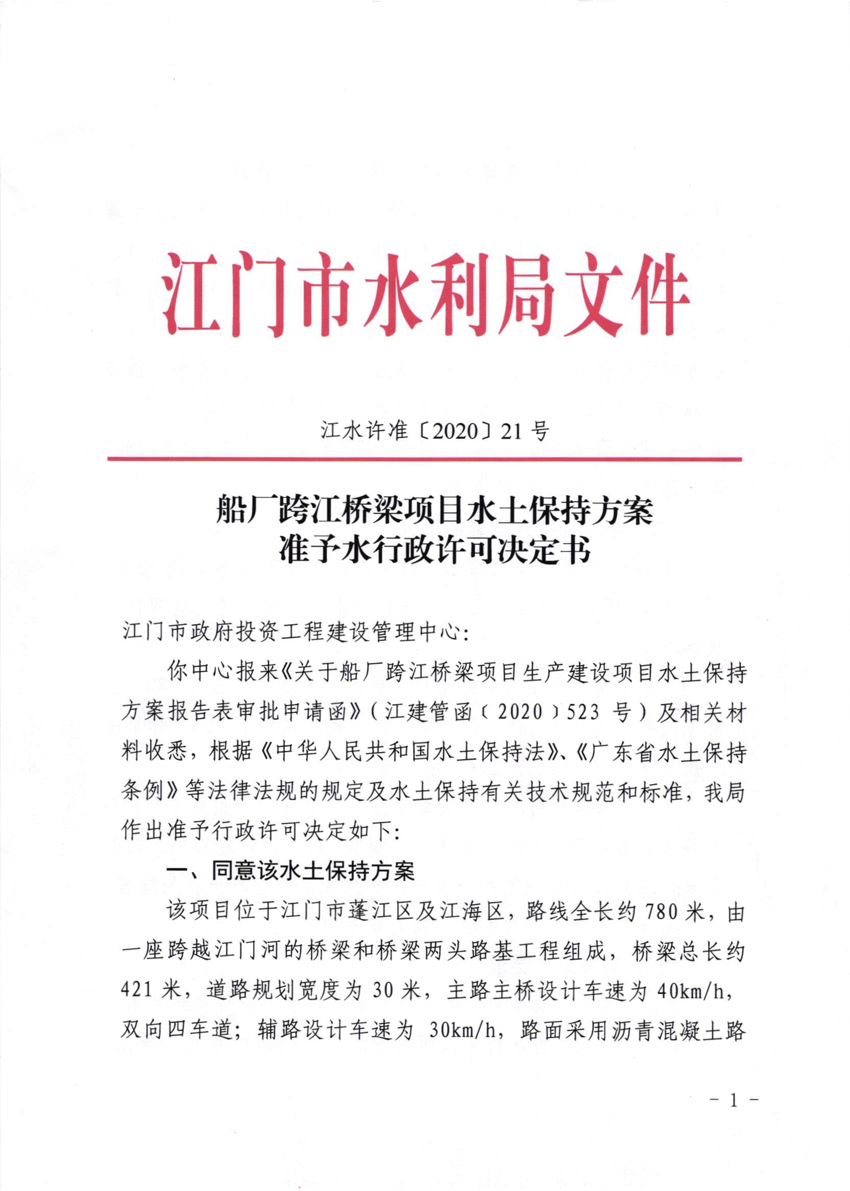 船厂跨江桥梁项目水土保持方案准予水行政许可决定书
