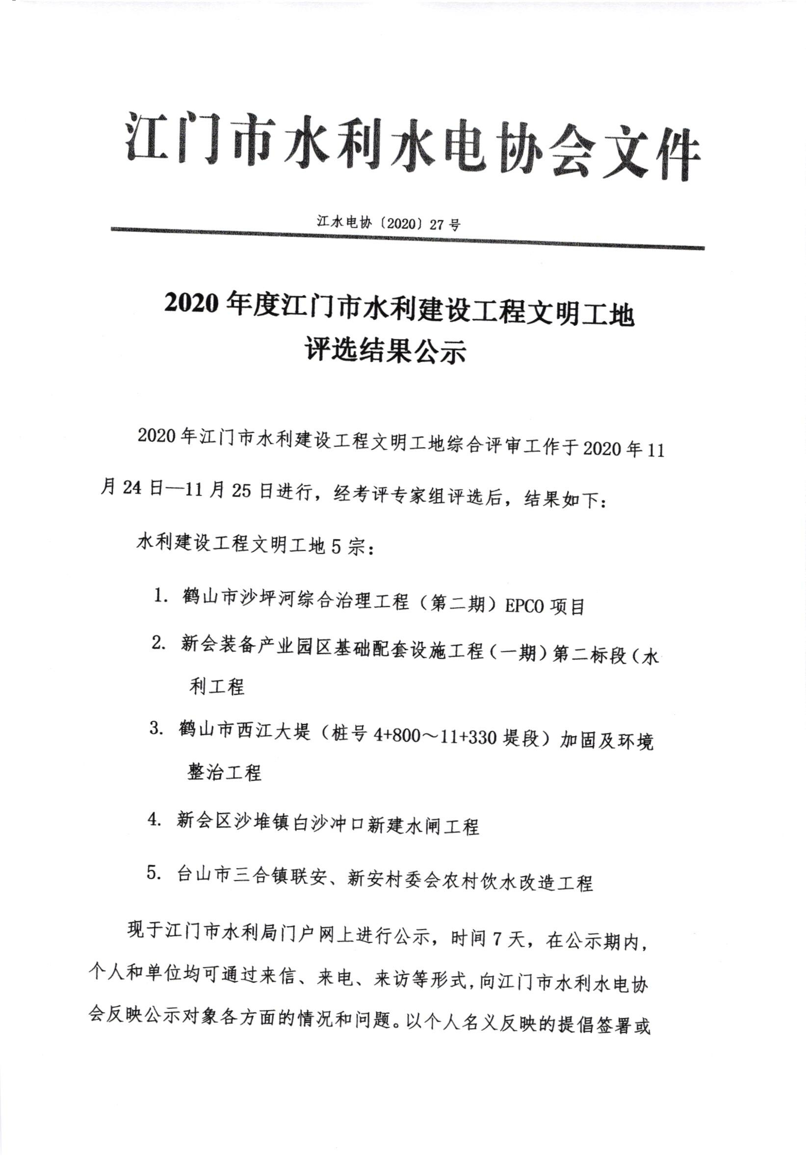 2020年度开云电竞官方网站水利建设工程文明工地评选结果公示