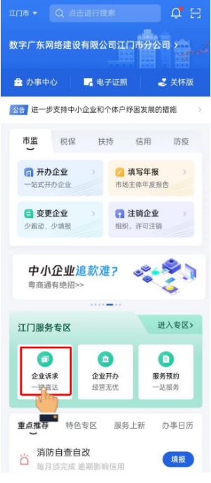 2.打开“粤商通”APP,在首页选择【江门服务专区-企业诉求】。