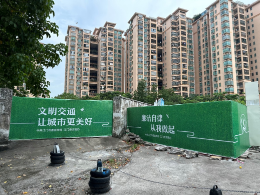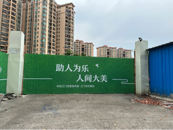 为配合做好我市创建全国文明城市工作,持续巩固创建成果,市土地储备积极投身常态化创文整改提升工作,致力提升城市形象。近日,市土地储备中心对政府储备土地围挡公益广告进行了排查,发现位于蓬江区甘棠路西侧、元岗山地段等政府储备土地的围挡公益广告由于长期受日晒雨淋、台风影响造成脱落、破损、褪色等情况,对此,我中心立即进行整改,主要开展了公益广告更新、广告文字笔画修补、草皮平整加固、围挡修补及铺草皮等工作。