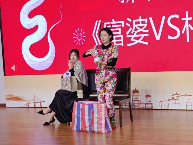 精彩的小品和舞台剧将舞台的欢乐气氛推到了最高潮。小品《富婆与村姑》中通过其独特的创意和演员们精湛的演技,成功地在舞台上塑造了两个截然不同而又生动鲜明的角色,为观众带来了无尽的欢乐。