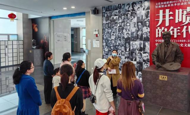 活动当天,授课老师在大堂进行展览导览时,吸引了许多原本在馆内参观的游客,他们也纷纷加入到研学的行列中。