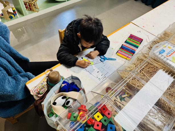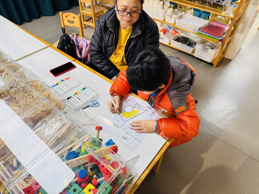 故事讲完后,进入了创意手工环节 —— 制作 “自己家的气象情绪转盘”。孩子们迫不及待地拿起画笔,在纸上认真描绘着自己家庭中的各种场景,并依据当天家庭成员的心情,用不同的气象元素进行标注。一个个充满爱意与童趣的家庭气象情绪转盘在亲子共同努力下诞生。