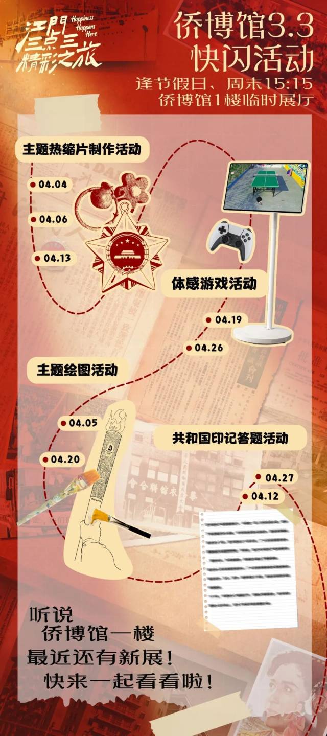 春风和煦,万物复苏,侨博邀你共赴一场春日的文化之约! 这个四月,除了踏青赏景,还有创意手工、趣味答题、体感游戏、主题绘画等你来解锁! 快收下这份活动日历,承包你的周末快乐~