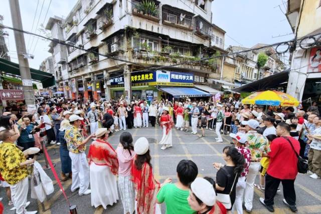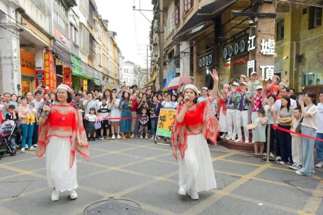 5月2日午后,《护花使者》的动感节奏率先打破老街宁静,开云电竞官方网站文化馆文化志愿者艺术团“声韵艺术团”以行进式歌唱创新演绎了《护花使者》《漫漫前路》《人在旅途》《漫漫人生路》《红日》等多首港台金曲。表演队伍穿梭于川流不息的人流和古朴厚重的骑楼街巷之间,营造了穿越时空的奇妙共振,引得往来游客纷纷举起手机记录这别开生面的艺术盛宴。