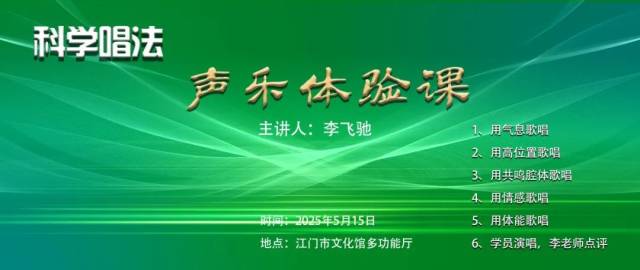 活动由我馆培训部主任李飞驰担任主讲。课程围绕“用气息歌唱”“用高位置歌唱”“用共鸣腔体歌唱”“用情感歌唱”“用体能歌唱”几大方面展开。李老师从气息运用、发声位置到情感表达,为大家系统解构了科学发声原理,并以《大海啊故乡》为范例,通过男女声部差异化指导,生动诠释科学发声技巧。现场学员在幽默风趣的教学中掌握了歌唱要领,掌声与欢笑声此起彼伏,气氛轻松活跃。