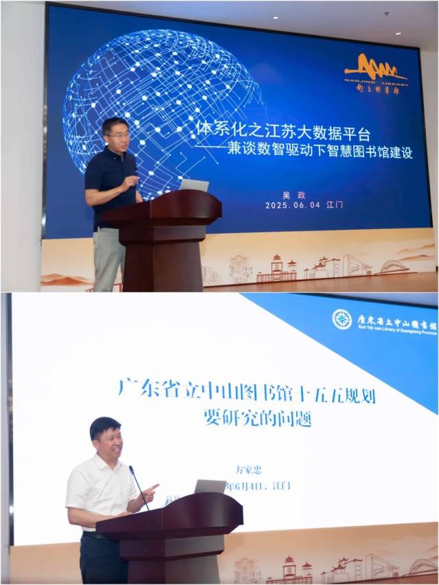 上午的培训环节由陈卫东主持。吴政以“体系化之江苏大数据平台建设——兼谈数智驱动下的智慧图书馆”为主题,讲解了区域图书馆大数据的数据来源构成、应用实践和探索。方家忠以“广东省立中山图书馆十五五规划要研究的问题”为主题,分享了广东省立中山图书馆编制“十五五”规划需要研究梳理的基本问题和重点工作思路。