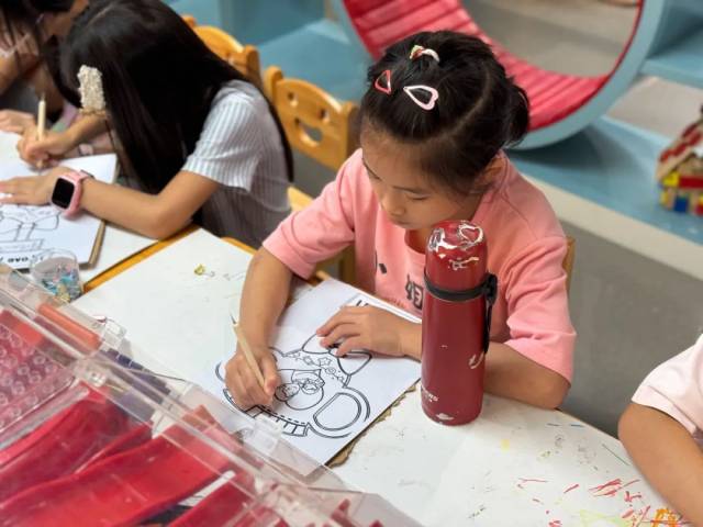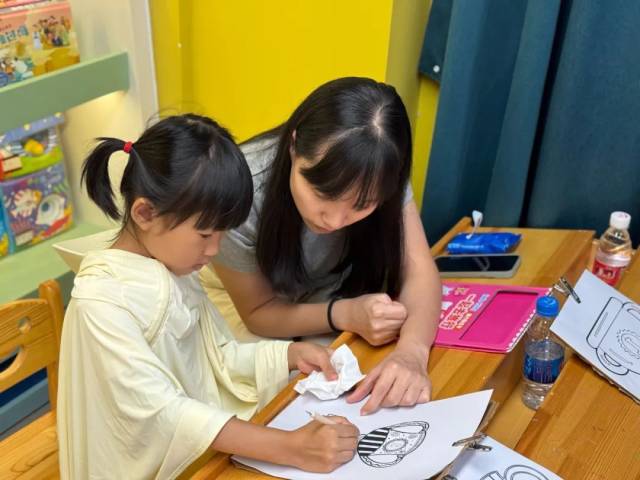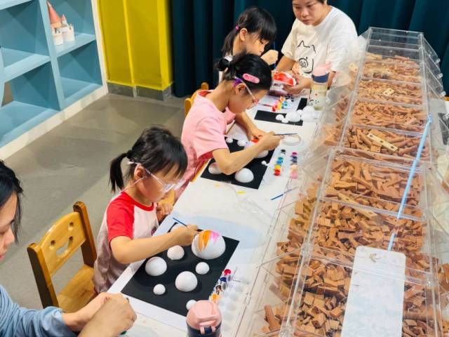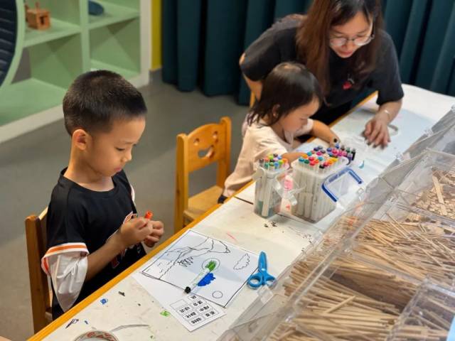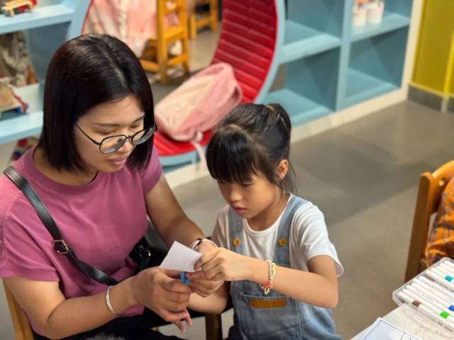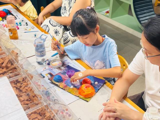 最受期待的当属手工制作环节——“我的小宇宙”。志愿者老师提前为大家准备好卡纸、半圆泡沫球等材料。在她们的耐心指导下,亲子们齐心协力开始制作。家长们帮助孩子将半圆泡沫球在卡纸上摆好位置,孩子们则小心翼翼地用胶水将其固定。随后,孩子们拿起画笔,充分发挥想象力,为“星球”涂上五彩斑斓的颜色。有的孩子把星球涂成梦幻的紫色,有的则选择充满活力的橙色,还有的用多种颜色搭配,创造出独一无二的“小宇宙”。