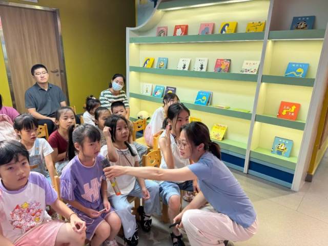 活动伊始,文化志愿者主讲老师热情地向大家打招呼,用轻快的语调调动起现场的气氛。“同学们,炎炎夏日,大家都有些什么消暑的好方法呢?这是一个谜语哟,大家一起来猜猜吧!” 老师抛出问题,孩子们纷纷举手,大声喊着 “游泳!”“吃冰淇淋!”“喝冰汽水!” 在孩子们的热烈回应中,老师神秘地说:“今天,老师要带大家去一个特别的地方 —— 西瓜游泳场!”随后,缓缓翻开绘本,为大家讲述起这个奇妙的故事。