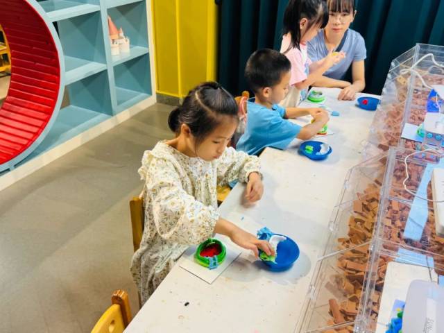 随后,亲子互动环节将活动推向了高潮。老师为每个家庭发放了手工材料,家长和孩子们一起动手,制作属于自己的 “西瓜游泳场”。孩子们发挥着无限的创意,用黏土捏出西瓜游泳场的形状,再捏出小动物,将它们组合在一起。有的孩子给西瓜游泳场加上了彩色的滑梯,有的为小动物们设计了漂亮的泳衣,现场充满了欢声笑语。