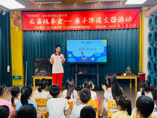 紧接着,进入绘本故事分享环节。志愿者老师声情并茂地讲述着《爸爸带我看宇宙》的故事,用生动的语言和丰富的表情,将书中爸爸带着孩子在夜晚漫步,一起探索宇宙的奇妙旅程娓娓道来。孩子们聚精会神地听着,明亮的眼睛里满是对宇宙的好奇与向往;故事里浓浓的父子情,深深打动了每一个人,现场不时响起阵阵轻柔的赞叹声。