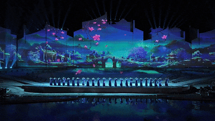 在古镇夜色中上演水与光的共舞;